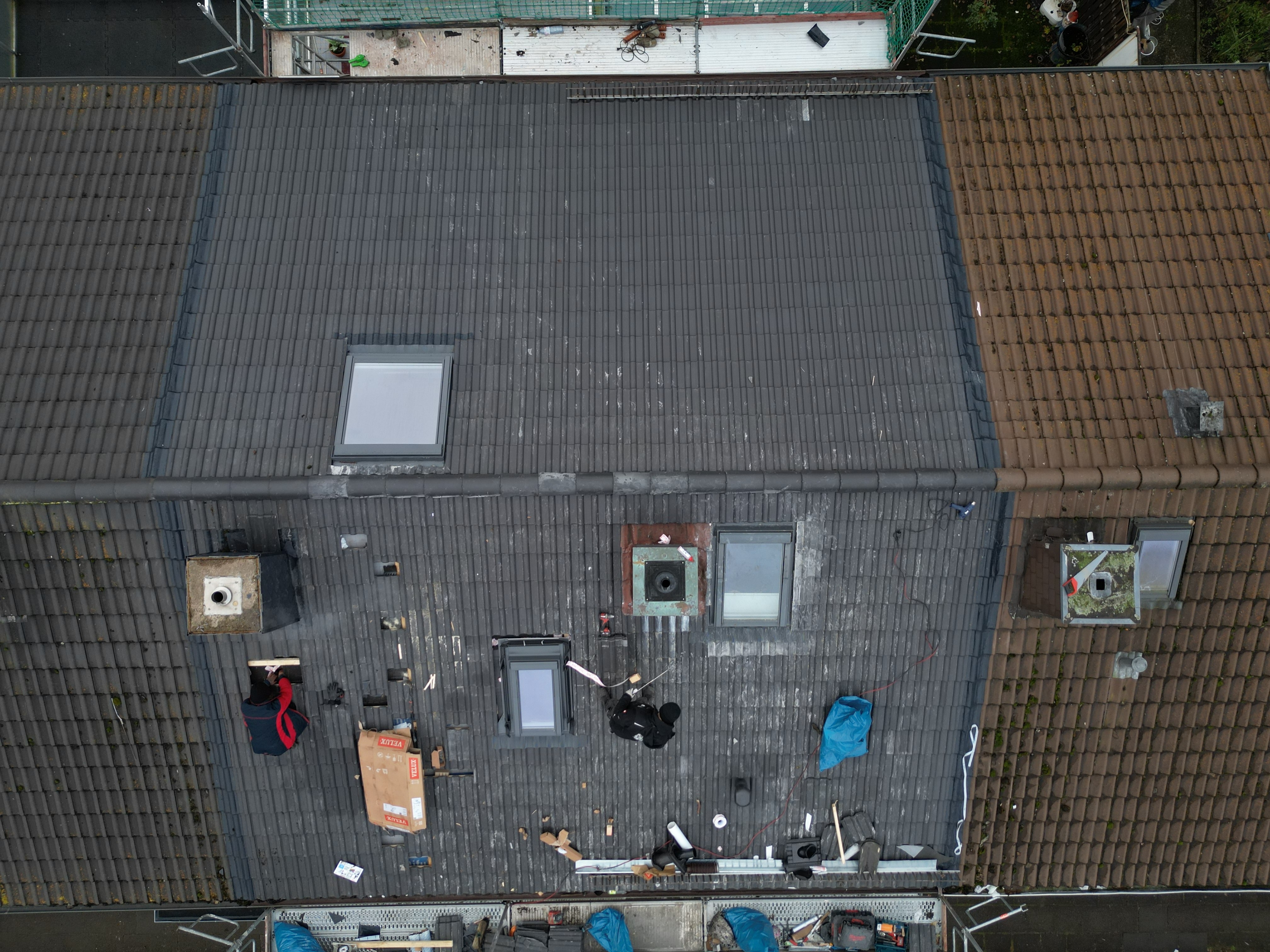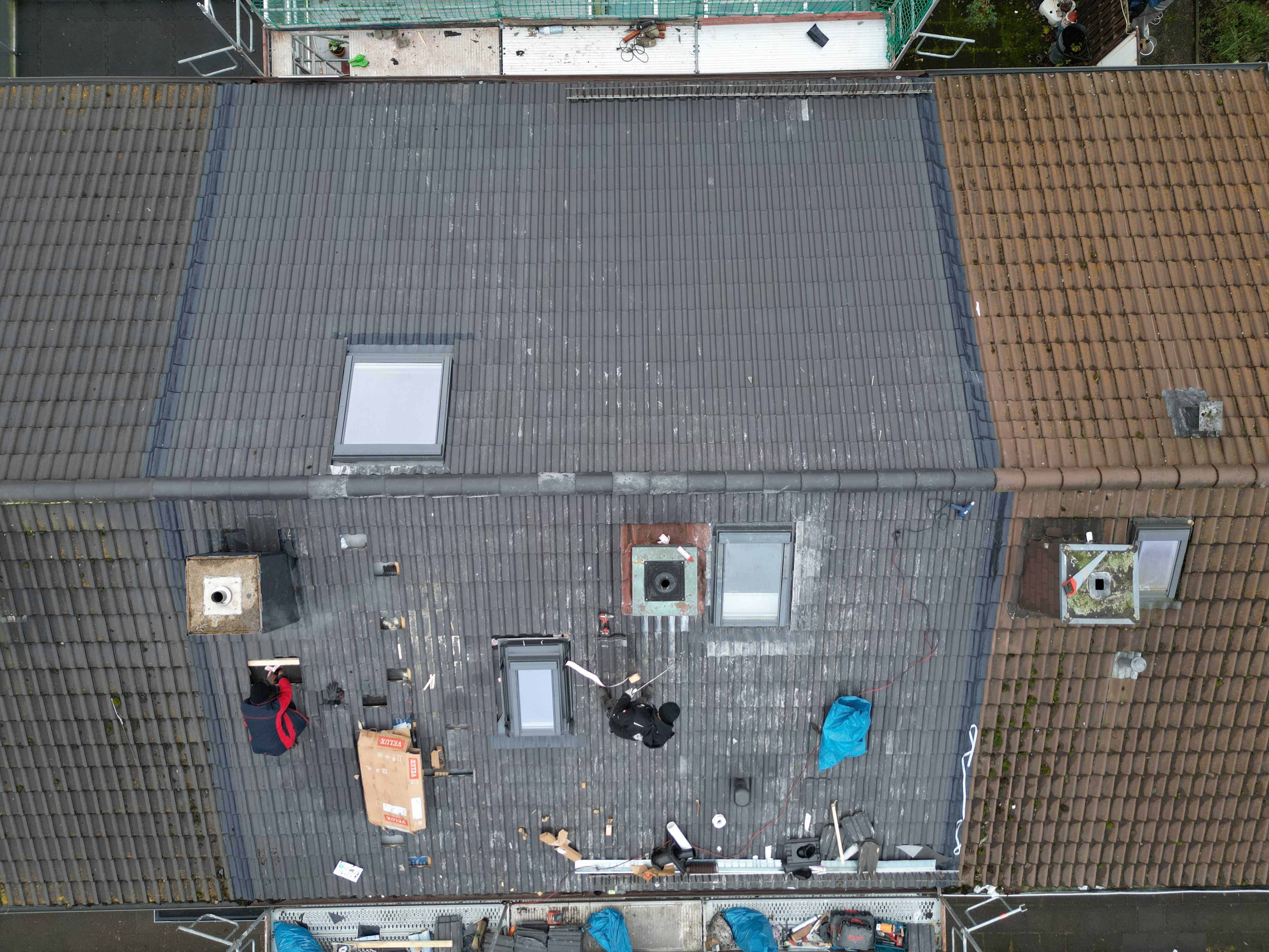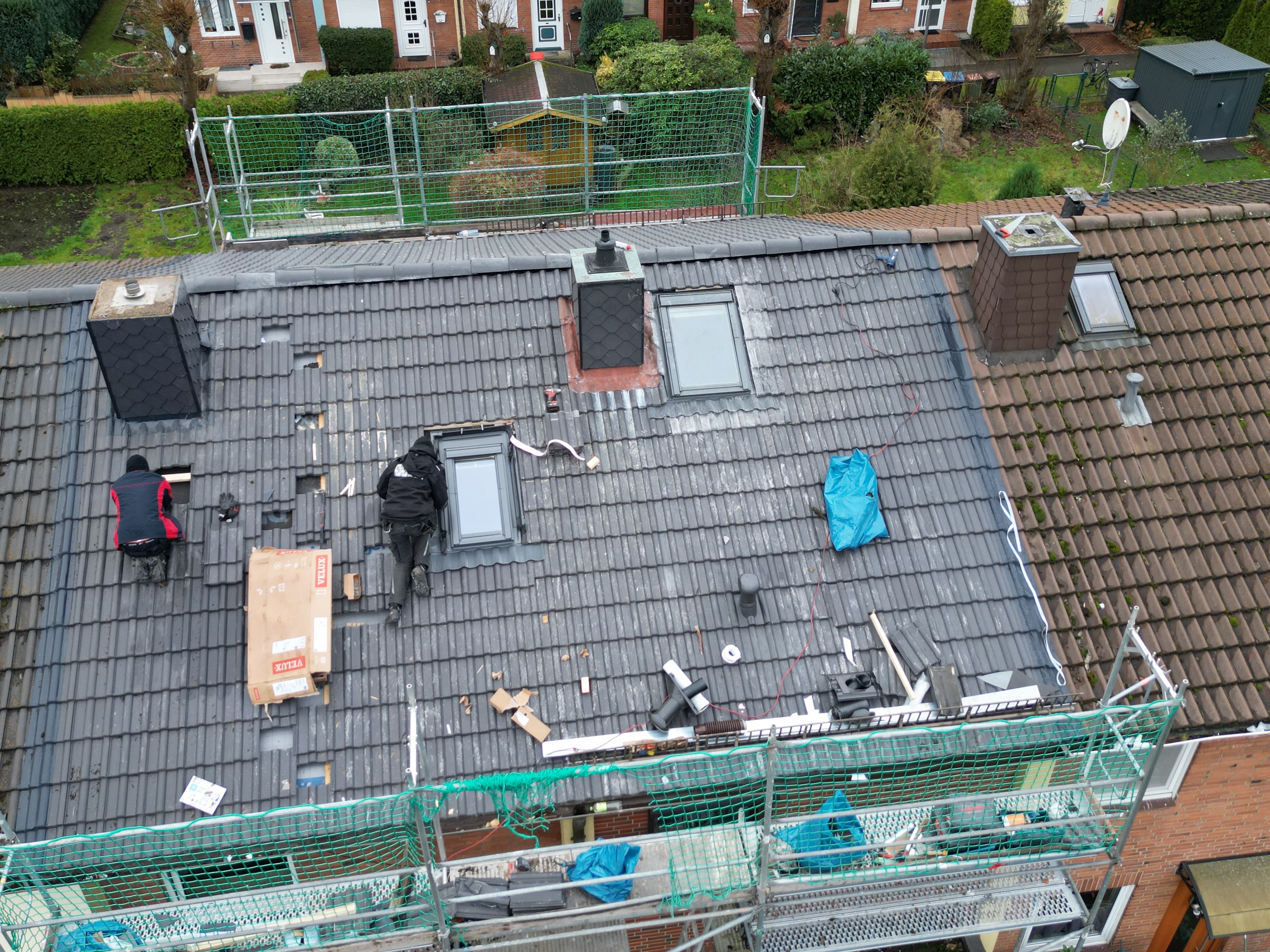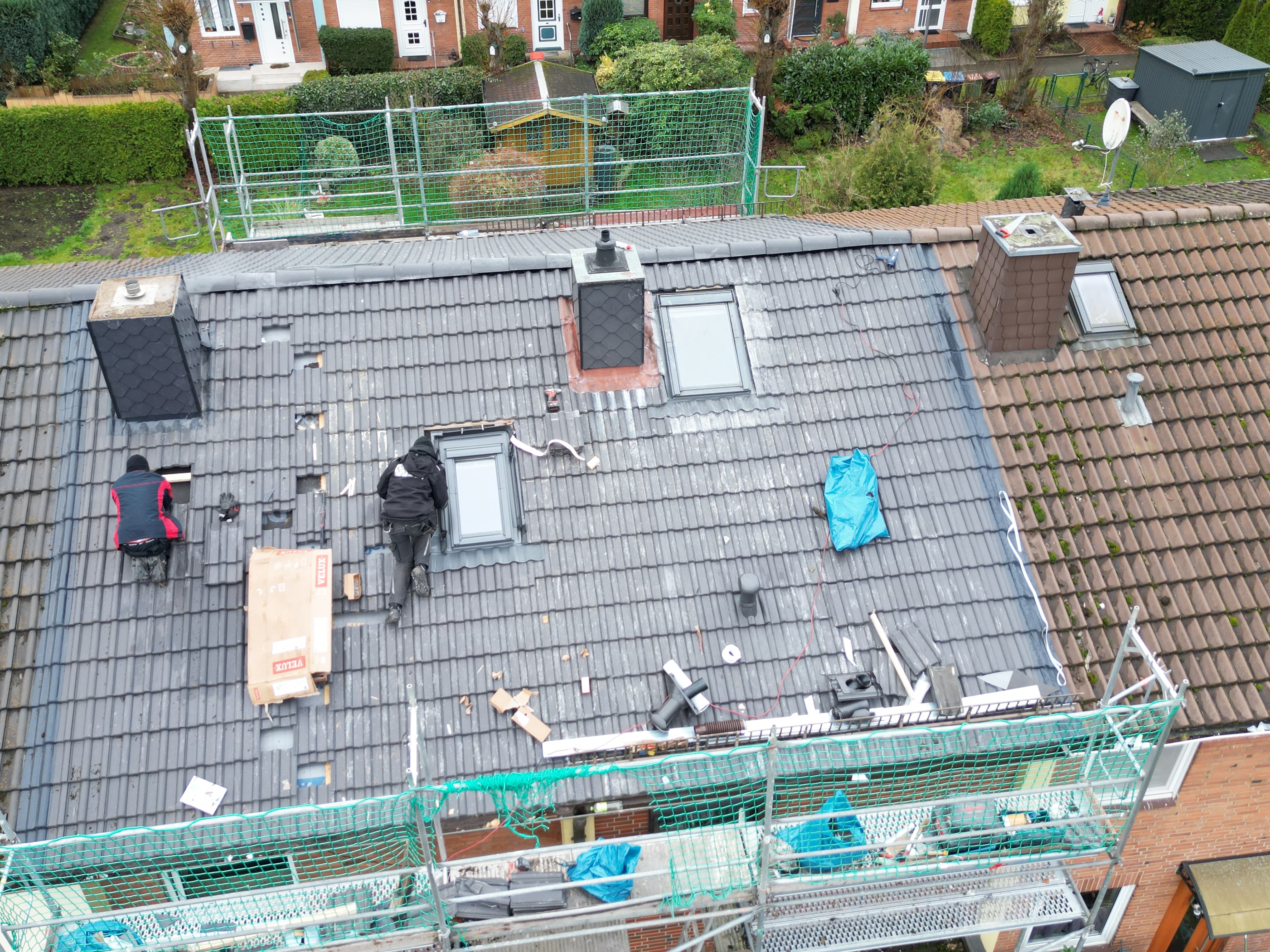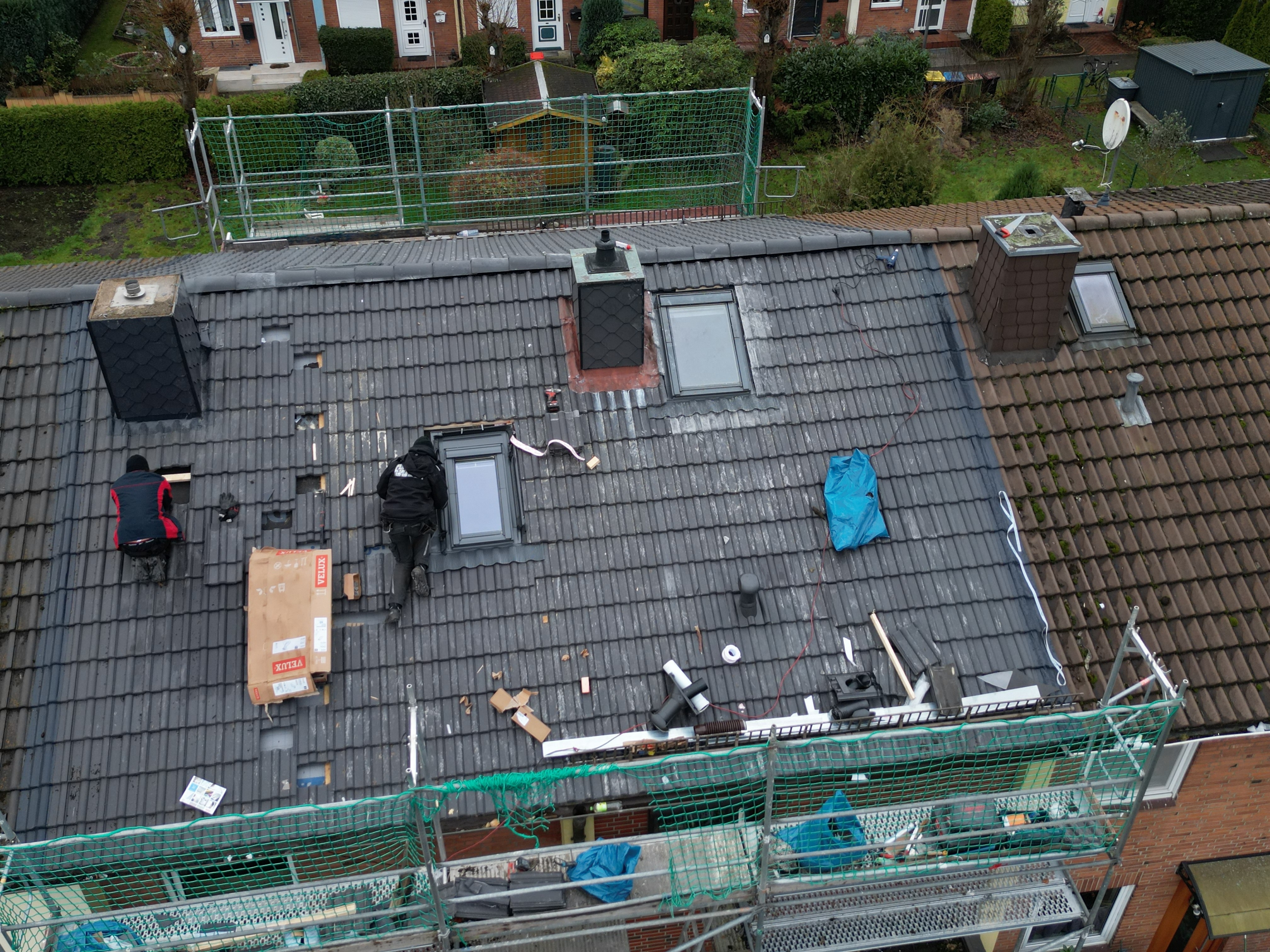 Im Zuge der Arbeiten wurde das Dach abschnittsweise geöffnet und der Unterbau überprüft. Anschließend erfolgte der fachgerechte Neuaufbau mit Unterspannbahn, Lattung und neuer Dacheindeckung. Alle Durchdringungen wie Dachfenster, Lüfter und Anschlüsse wurden sauber neu ausgeführt und regensicher eingebunden. Die Neueindeckung sorgt für eine gleichmäßige Optik und zuverlässigen Schutz.