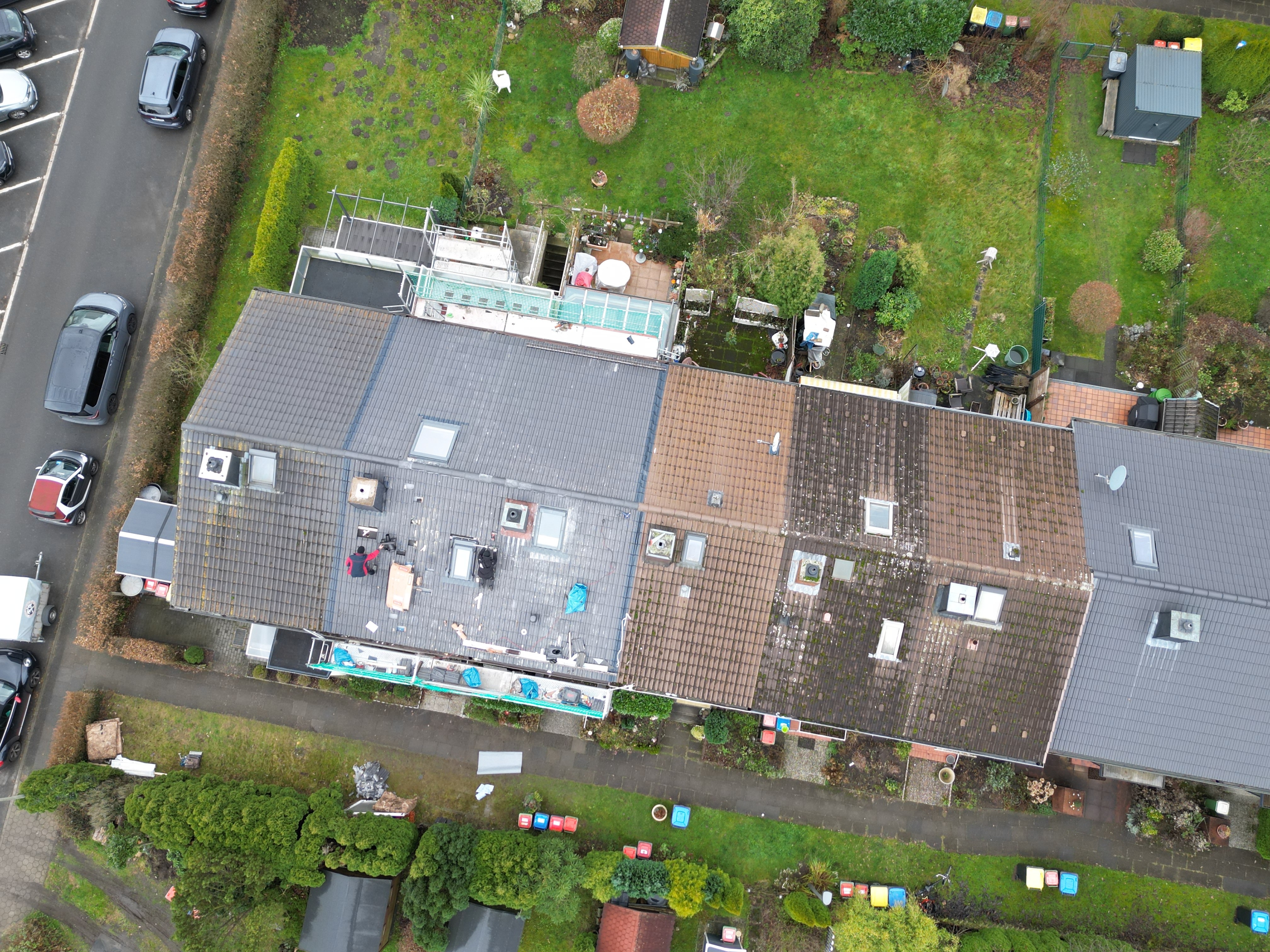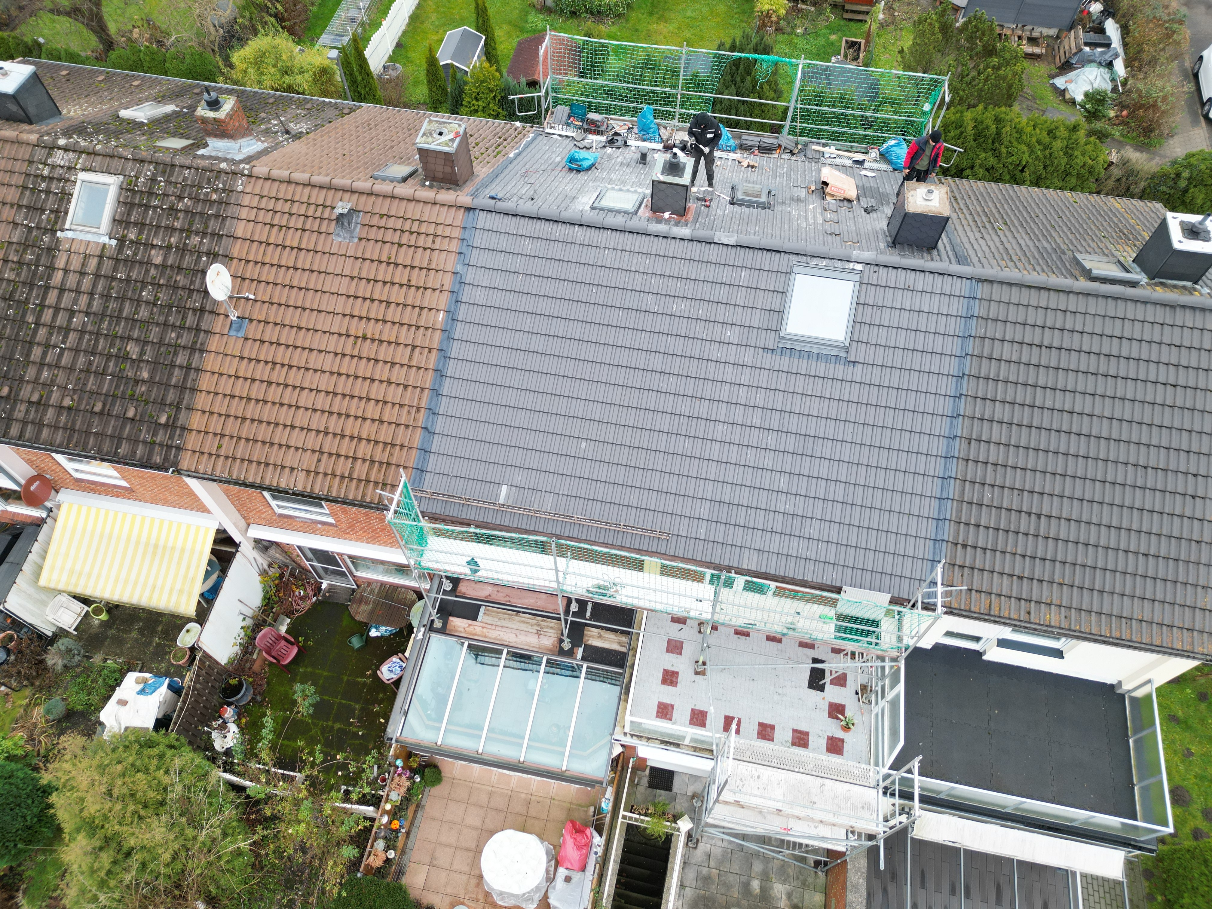 Bei diesem Reihenhaus in Heusenstamm nahe Offenbach am Main war die bestehende Dacheindeckung deutlich in die Jahre gekommen. Die Dachziegel wiesen Abnutzungen auf, einzelne Anschlüsse entsprachen nicht mehr dem heutigen Stand der Technik. Um Folgeschäden durch Feuchtigkeit zu vermeiden, wurde eine vollständige Sanierung des Steildaches notwendig.